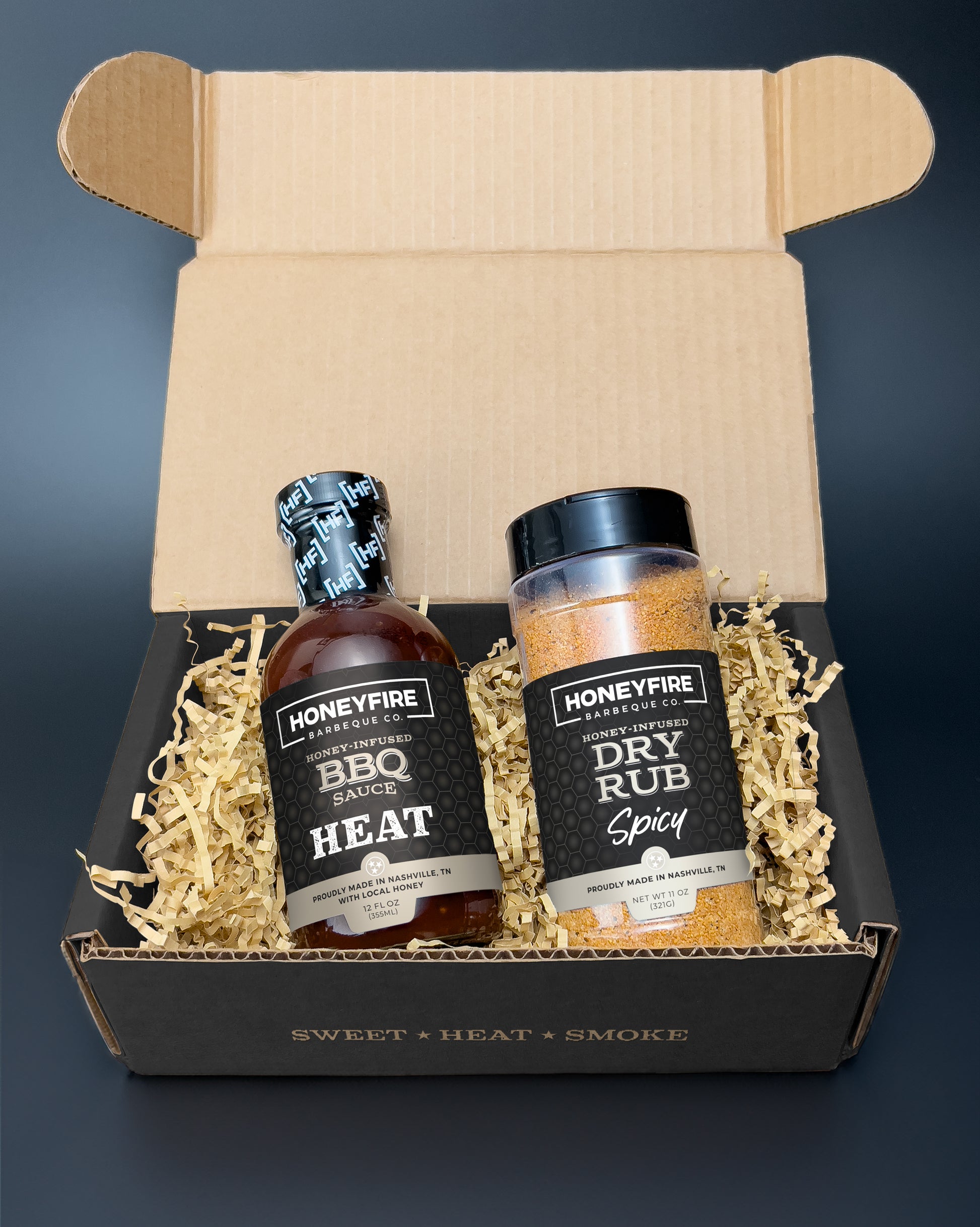 Give the gift of heat! Our “Spicy & Heat” BBQ gift set puts the FIRE in HoneyFire! A special blend of peppers and fine spices ramps up our honey-based blend Original Barbecue Sauce and Dry Rub for an extra kick. Includes HoneyFire Spicy Dry Rub and Heat BBQ Sauce.