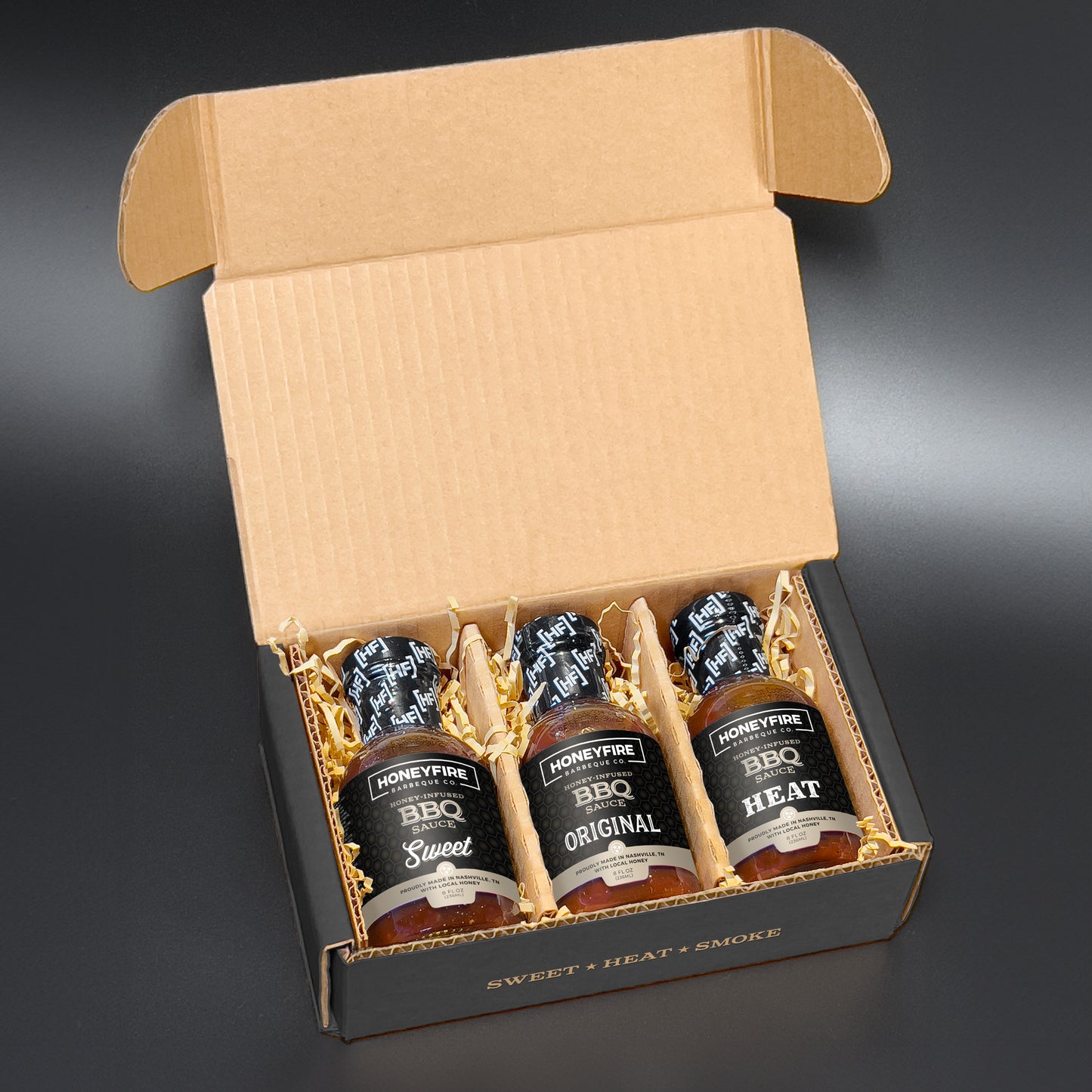 The HoneyFire BBQ Sauce Sampler is the perfect gift for the barbeque aficionados in your life. This collection includes three 8-ounce bottles of our Honey-Infused BBQ Sauces: Original, Sweet, and Heat.