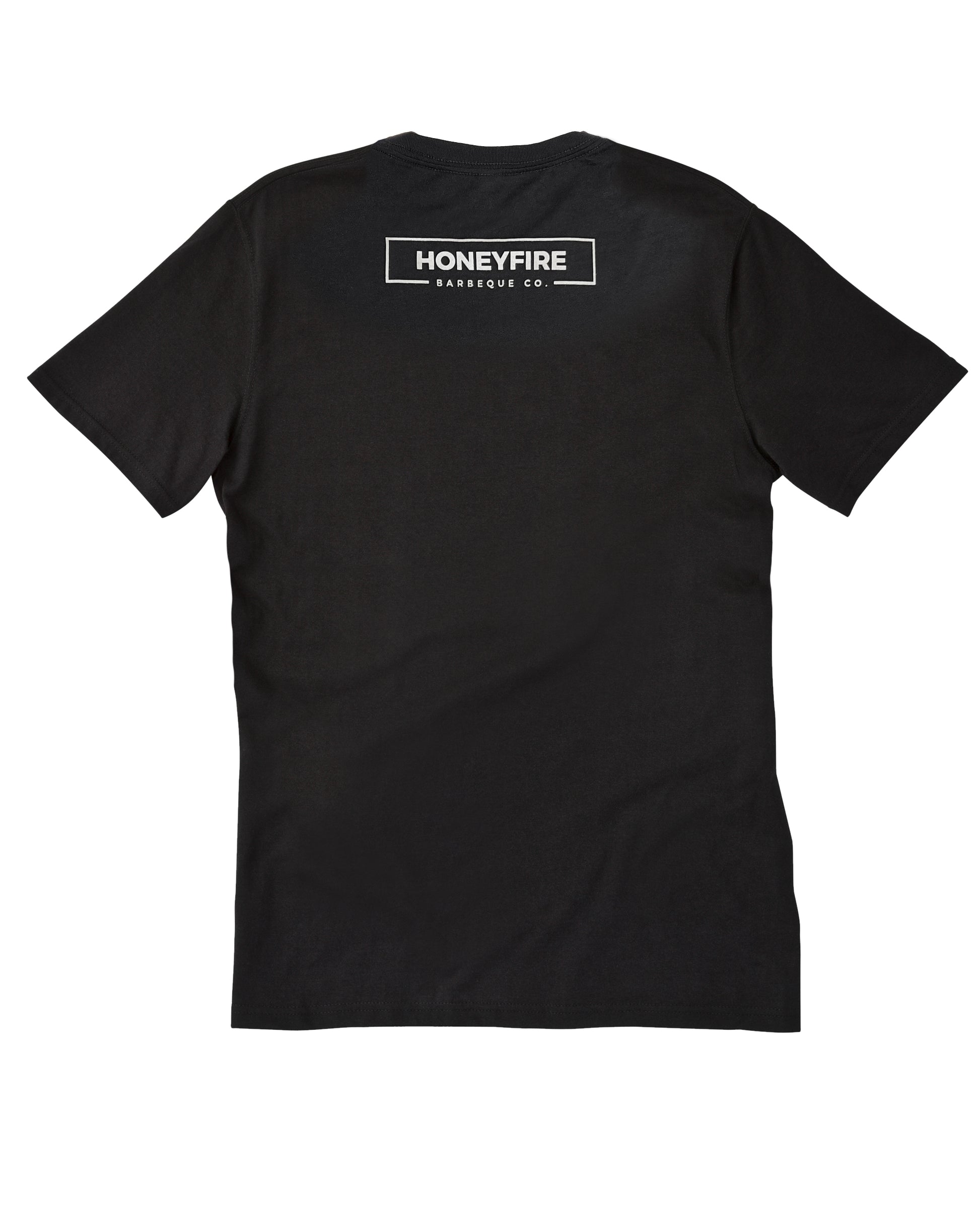• Black tee with white imprint on front and HoneyFire logo on the back